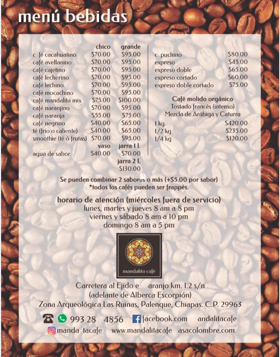 Welcome to Mandalita Café, a charming cafeteria nestled in the heart of Palenque, Chiapas, right by the historic Zona Arqueológica Las Ruinas. This delightful spot showcases a menu that caters to all your cravings—be it breakfast, lunch, or dinner. Guests can savor a variety of freshly prepared dishes, all delivered with a personal touch.